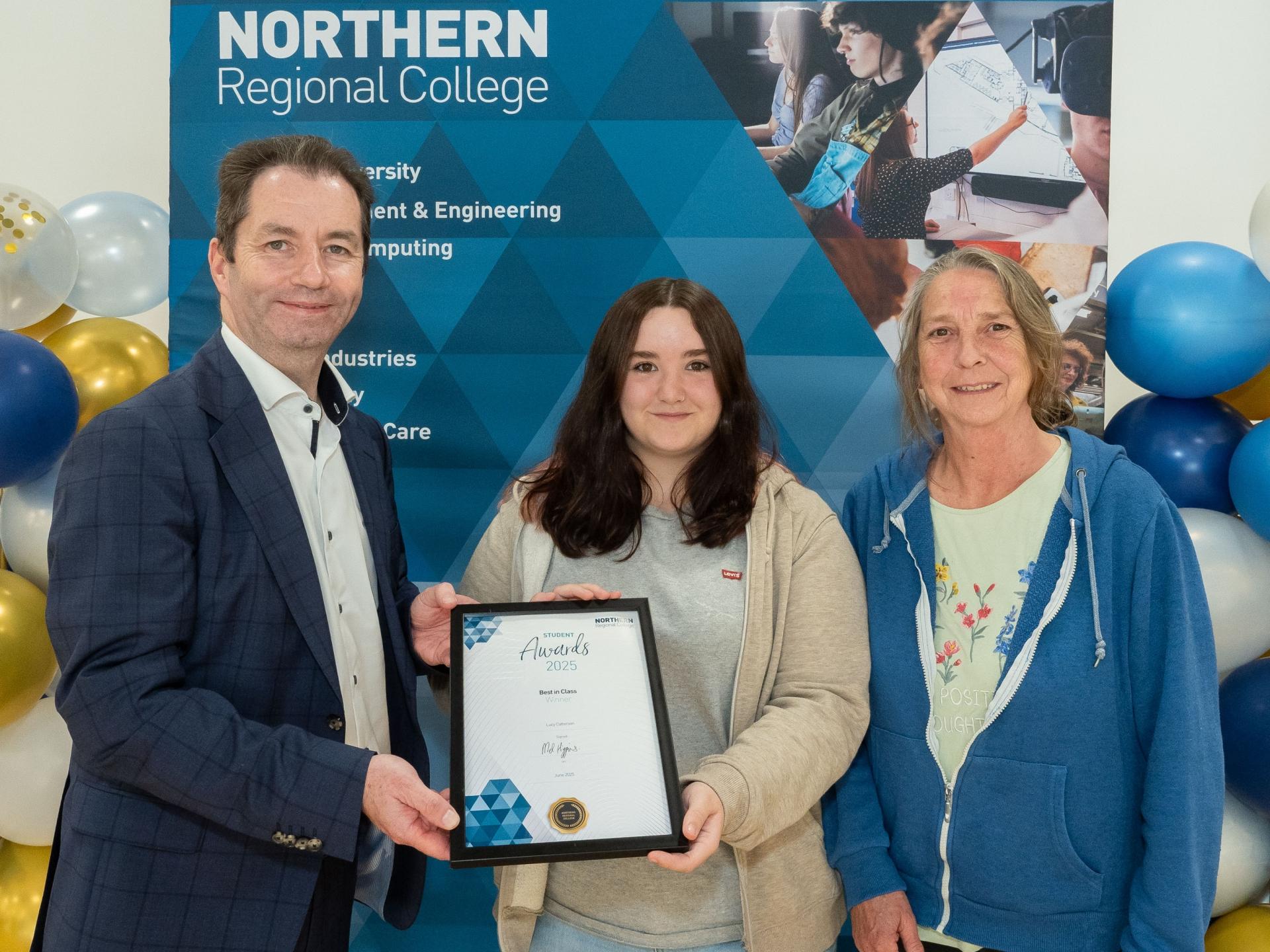 Business student Lucy Catterson winner of the Best in Class award pictured with Tanya Catterson and College Principal & Chief Executive, Mel Higgins.