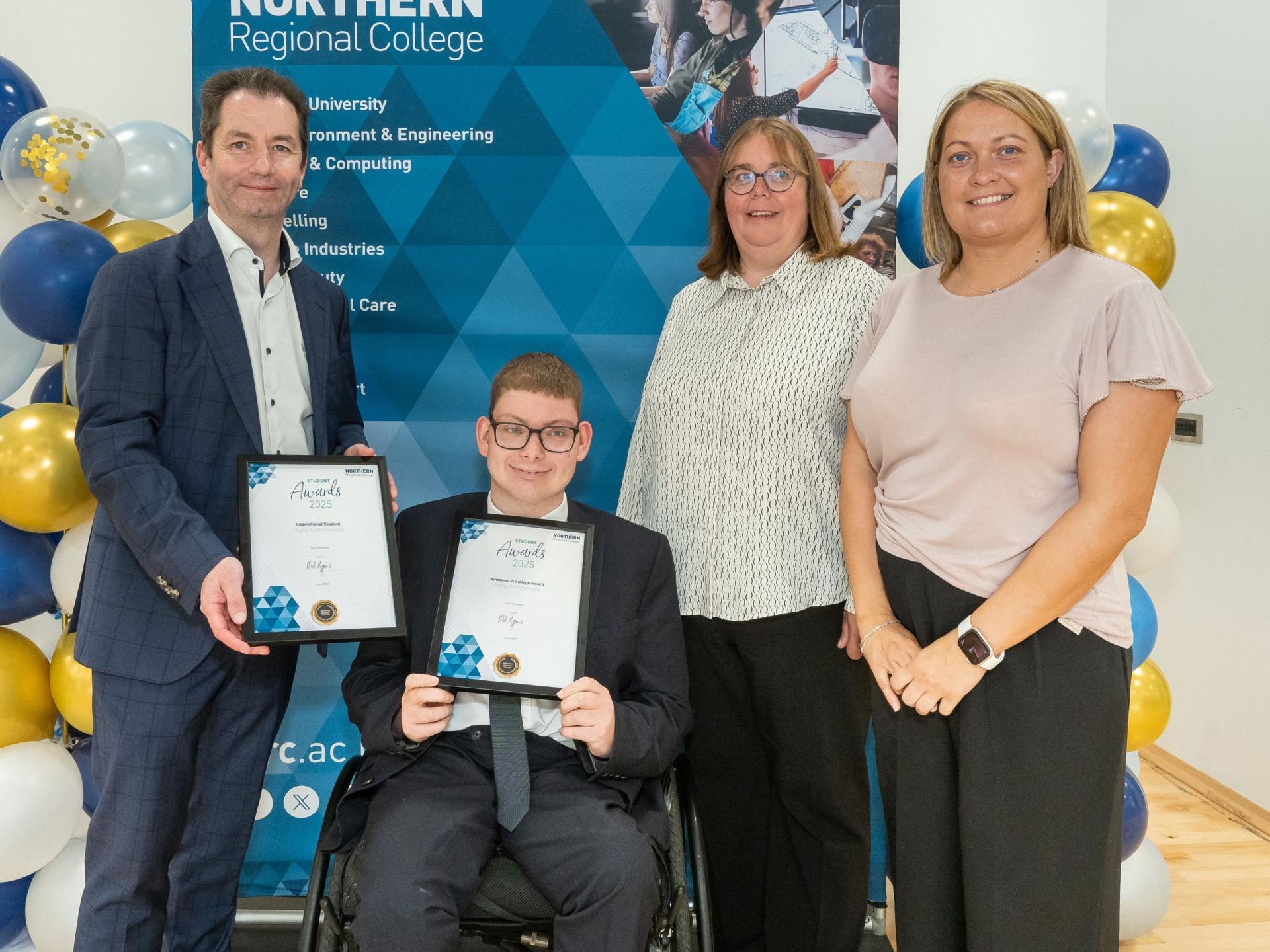 Tom Woodrow, recipient of the Kindness in College Award and Highly Commended in the Inspirational Student category, pictured with Karen Woodrow, Elaine Dickson and Mel Higgins, Principal & Chief Executive of Northern Regional College.
