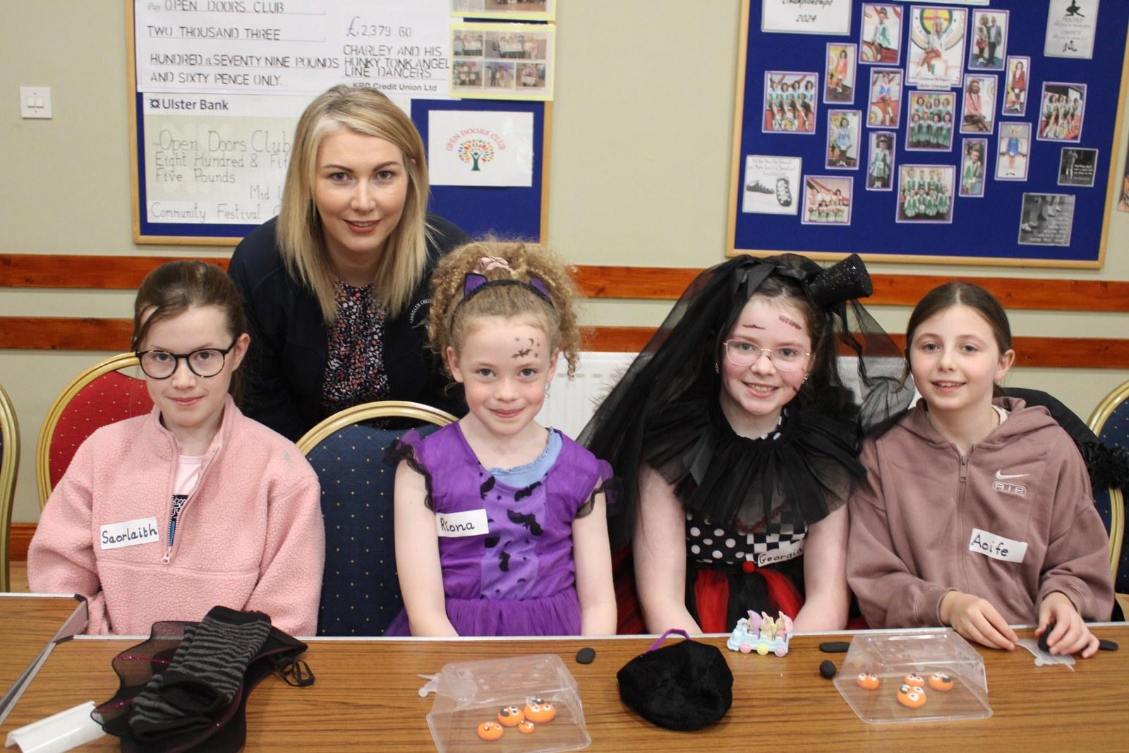 Saorlaith, Ríona, Georgia and great friend, Aoife, pictured with Michelle McEldowney from sponsors, Carnglen Credit Union, Maghera.