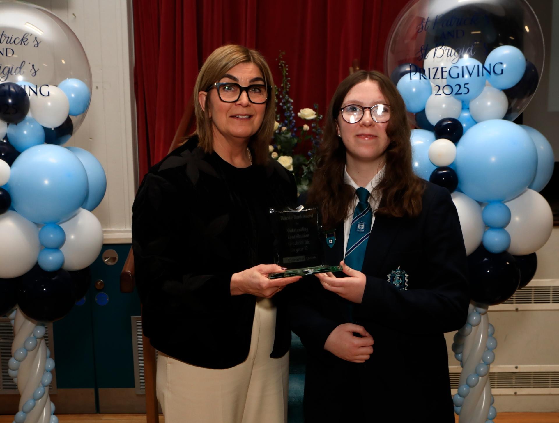 Helen Crossan presents the Danske Bank Award for outstanding contribution to school life to Erin O'Kane.