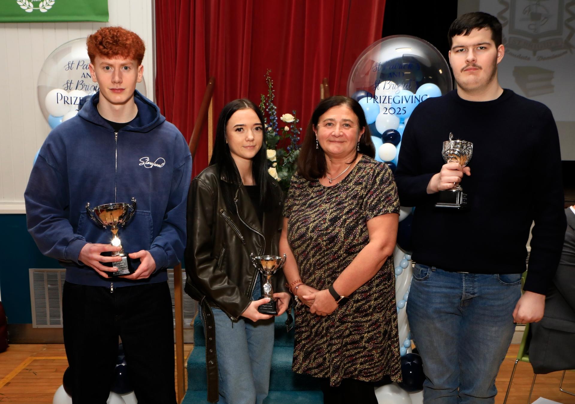 Mrs. P. Devlin who presented, from left, the Academic Achievement in Double Award Science to Fintan, the OCN Science Award to Cara Gallagher and the Academic Achievement in Single Award Science to Dean Brolly.
