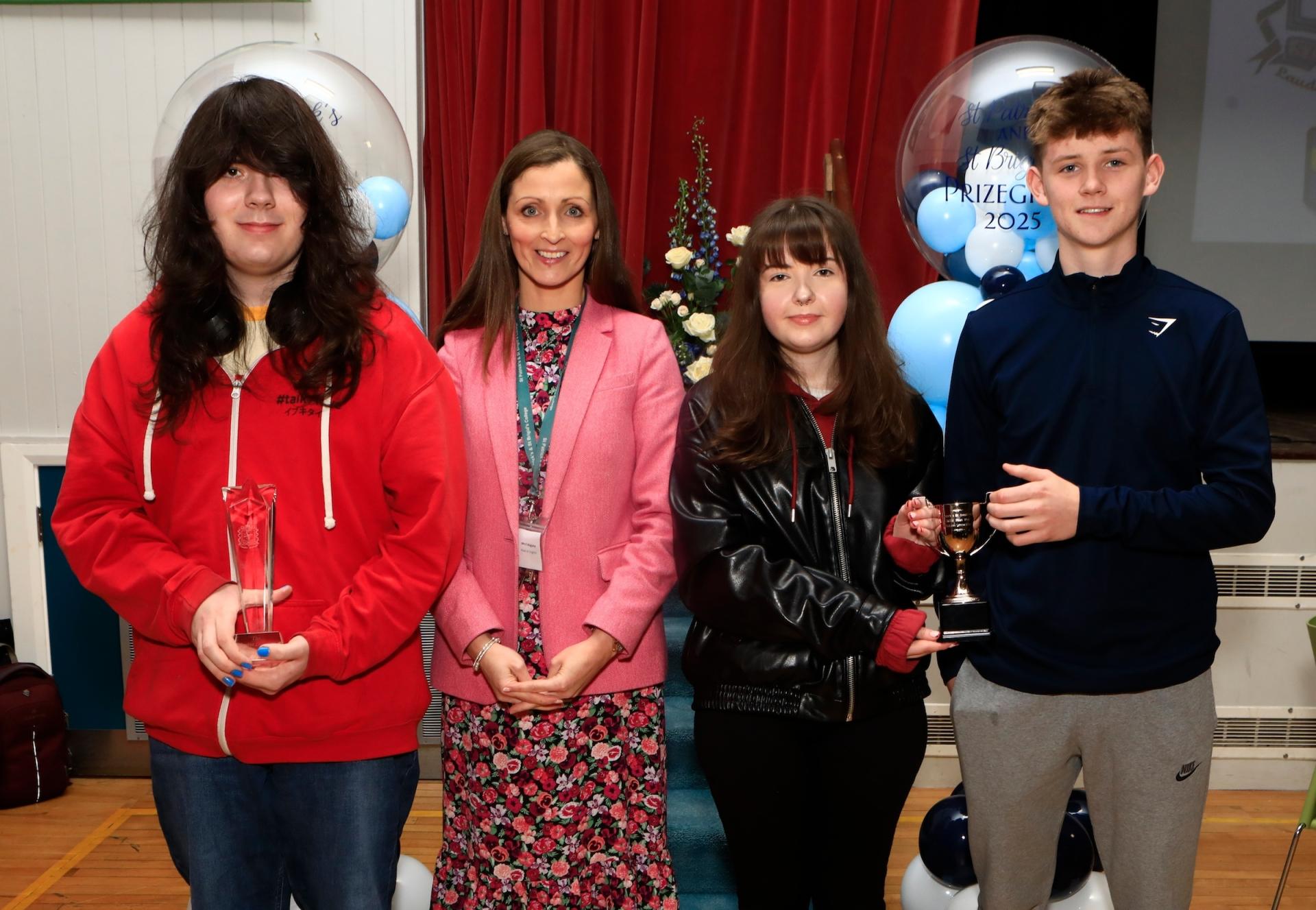 Mrs. S. Maguire with on left Art Dobbin, awarded the Martin Downey Award for English, and on right, joint winners of the GCSE Prize for English Literature, Casey Hutchison and Finn McCloskey.