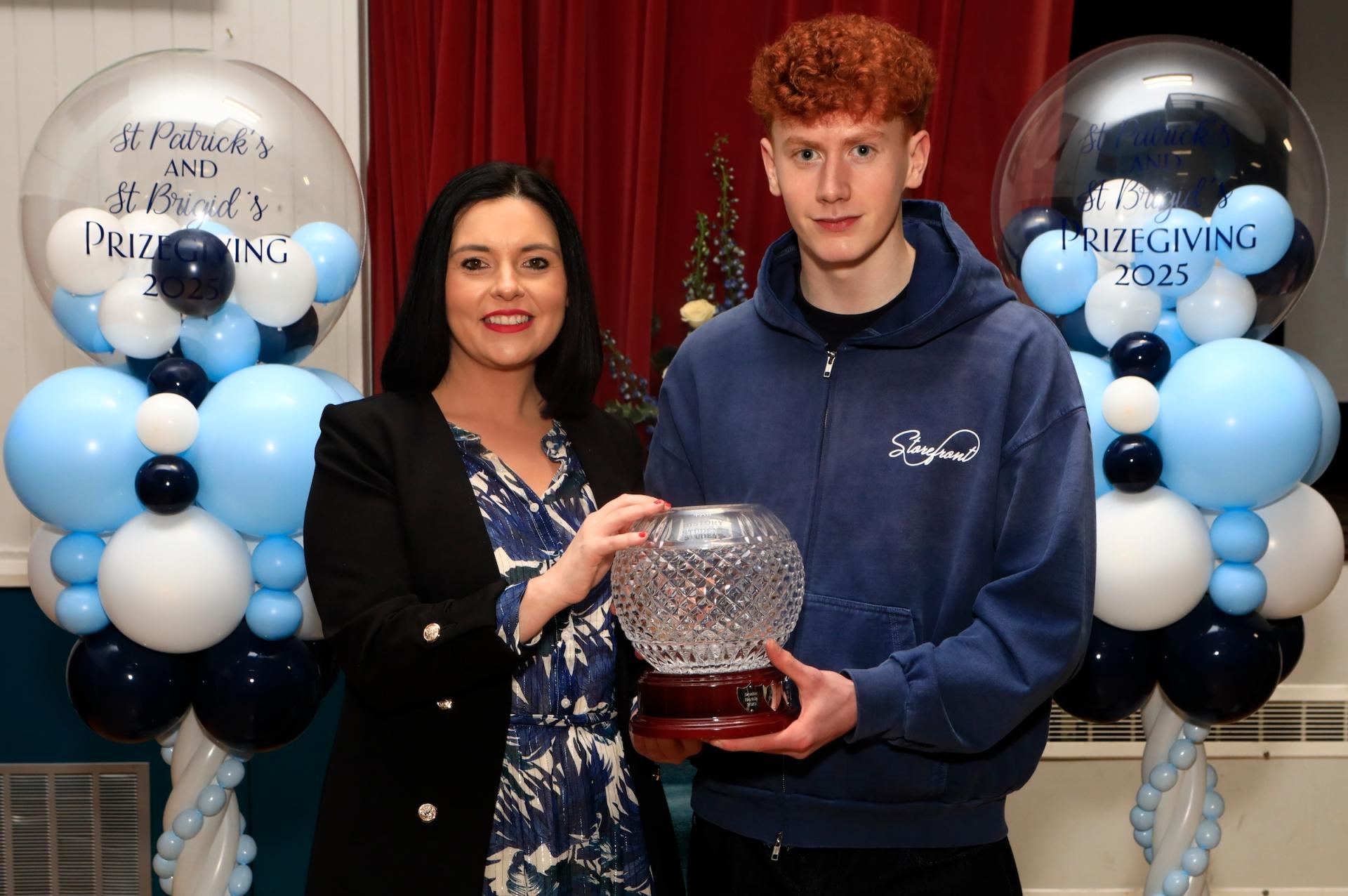 Mrs. C. O'Kane presents the History Award for the Top GCSE Student, Fintan O'Hara at the St. Patrick's & St. Brigid's College (Claudy) prizegiving 2025.