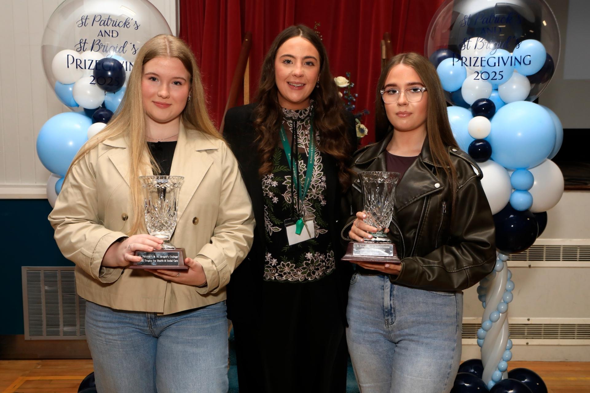 Miss A. Kelly presents the GCSE Trophy for Health and Social Care to Erin Loughrey and the Top Achiever in Occupational Studies (Hospitality & Catering) to Emma Hasson.