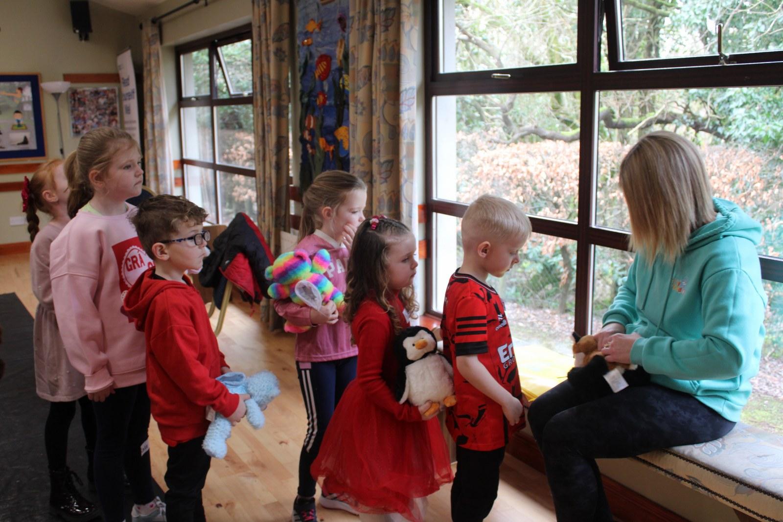 Some of the children lining up beautifully for Joanne to put the finishing touches to their teddies.