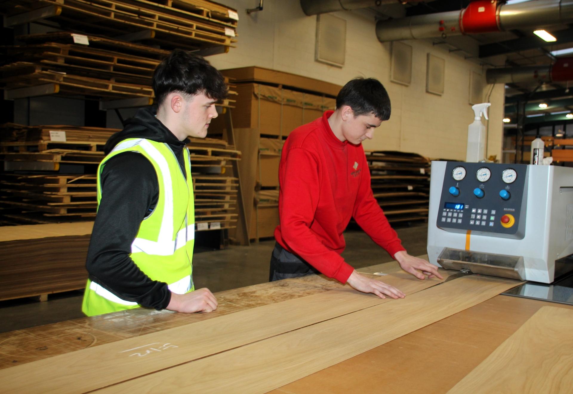 Joey Mullan shows Oliver McFerran how the veneer stitching machine works.