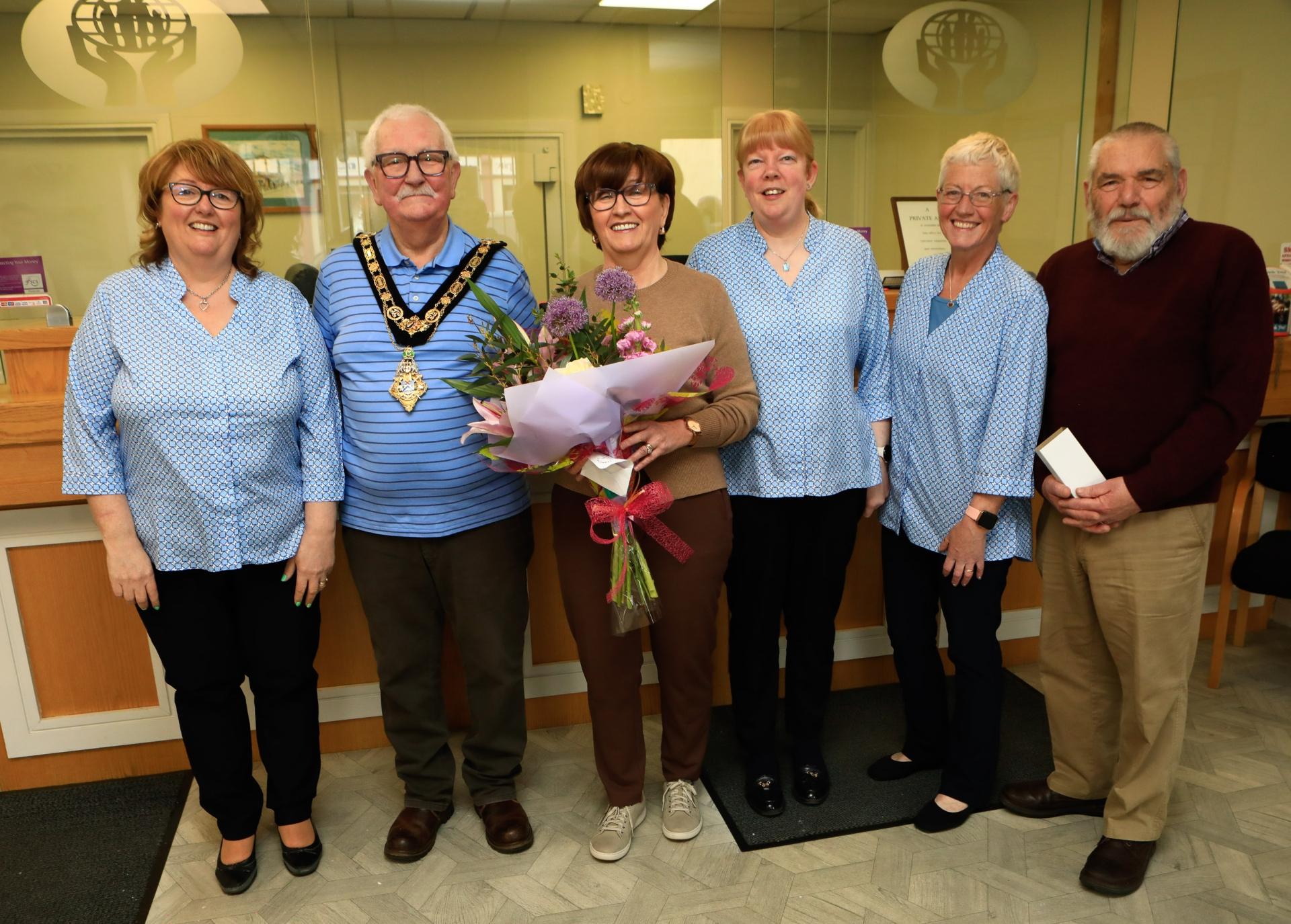 Regina McVey, new manager, Mayor Councillor Oliver McMullan, and on right, Hugh O’Neill, retiring after 53 years serving as a director, Michelle McGilligan and Donna McCloskey.