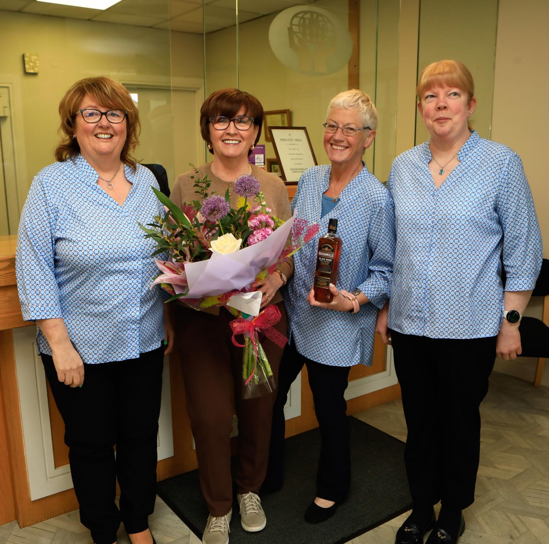 Martina Boyle, manager Dungiven Credit Union retiring after 48 years service with staff members, Regina McVey, new manager, and from right, Donna McCloskey and Michelle McGilligan and Donna McCloskey.