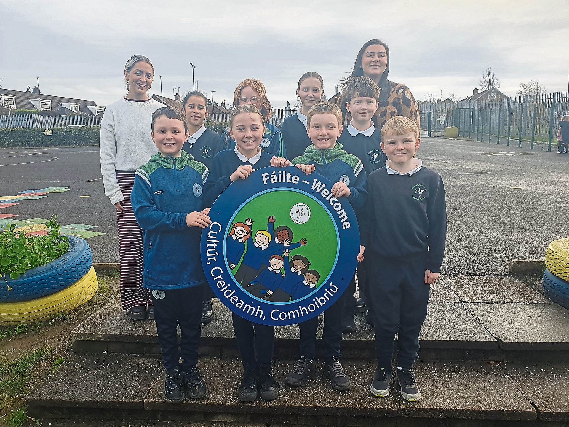 Bunscoil Colmcille R6 & R7 pupils with Múnteoir Saoirse (left) and Múnteoir Erin.