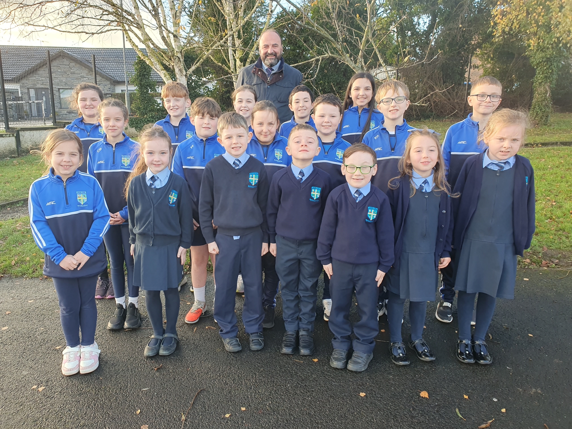 Hollybush PS pupils with principal Mr principal Feargal Friel