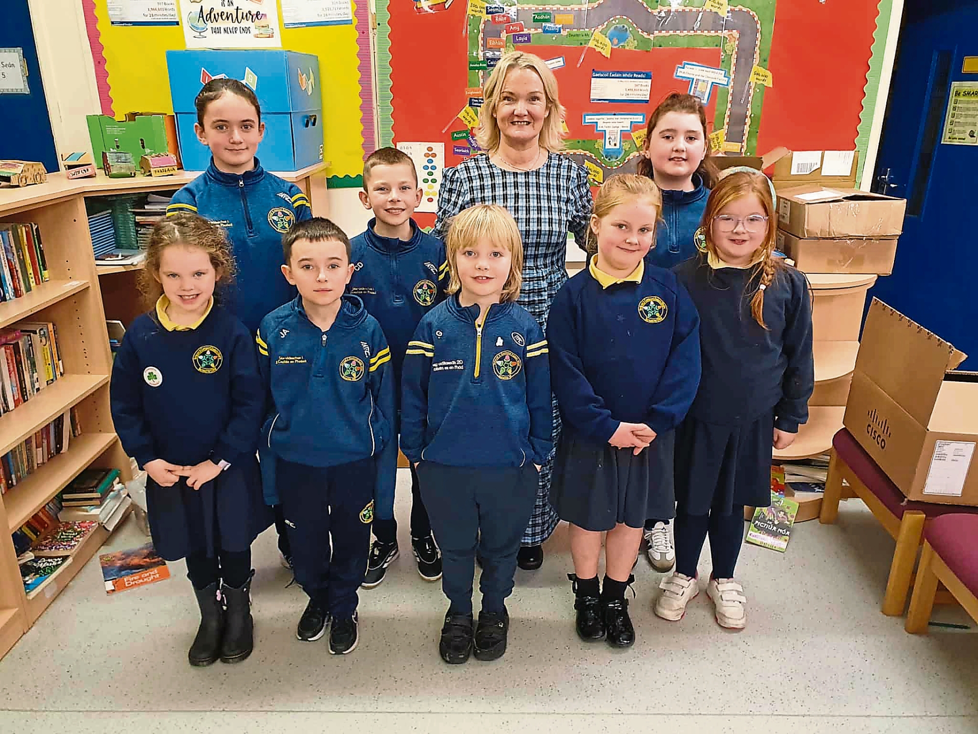 Gaelscoil Éadain Mhóir students, Luighseach, Cian, Amelia, Jack, Avril, Daithí, Emerald and Scarlett, with Múinteoir Alicia.