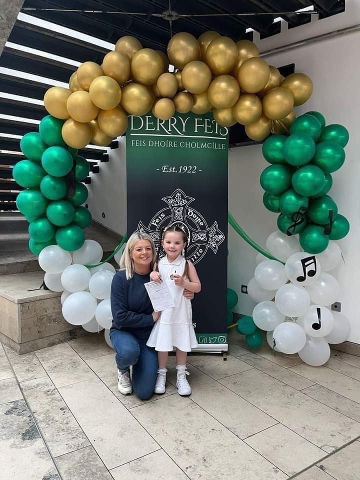 Zara White who won 1st place in the Children’s Verse Primary 1-2. Zara won 2nd place in the Irish Song Primary 2 & also won 2nd place in the English Song Primary 2. Zara is a pupil of Claire Doherty School pictured with her Singing teacher Mrs Claire Doherty.
