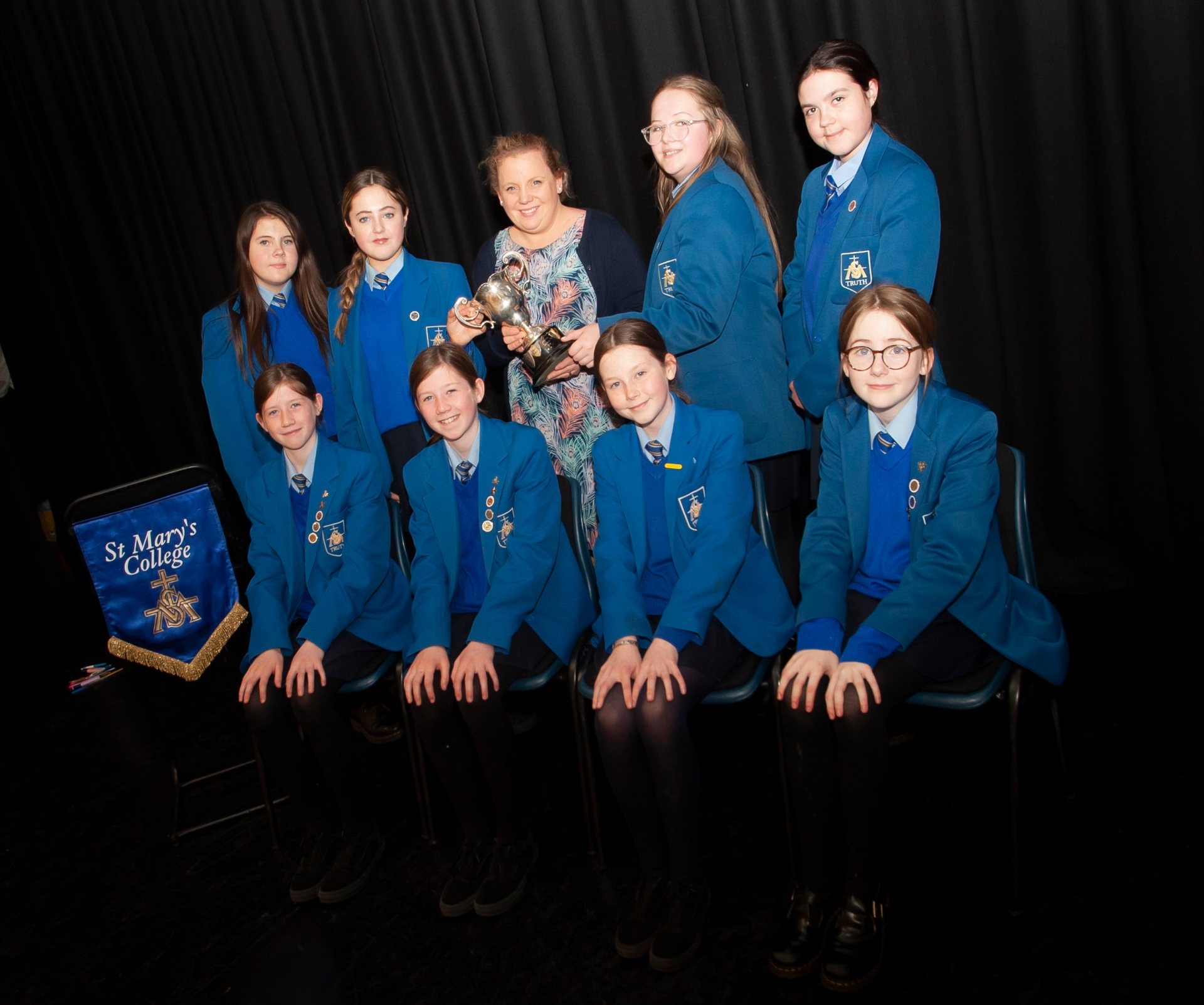 St. Mary’s College - Irish Choral Verse Post-Primary winners at the recent Feis Dhoire Cholmcille. Front from left are Farragh Crossan, Roma Crossan, Oonagh Conkery and Millie Lyttle. Back from left, Macey-Rae McGonagle, Daire McCallion, Mrs. Caitriona Devlin, Irish teacher, Aleigha McChrystal and Cara McGarrigle. (Photos: Jim McCafferty Photography)