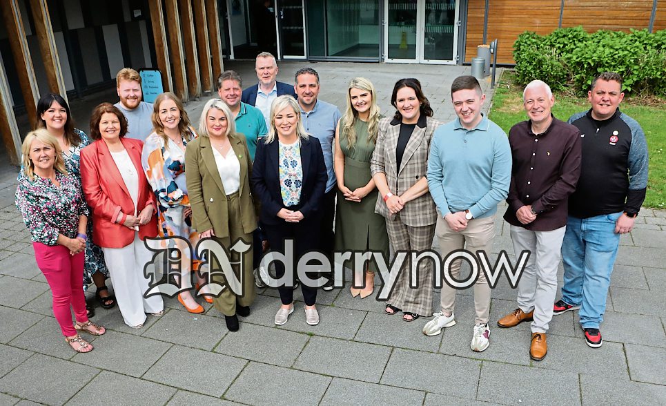Sinn Fein's vice-president and NI Assembly First Minister designate Michelle O'Neill MLA and Ciara Ferguson, MLA, picture with Sinn Fein's newly elected councillors when she visited the Foyle Arena on Saturday. (Photos - Tom Heaney, nwpresspics)