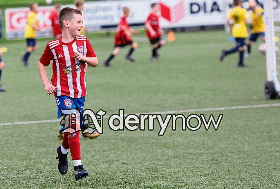 Core Soccer Academy's U8s Harry Devenney celebrates his goal against Portstewart Sea Hawks.