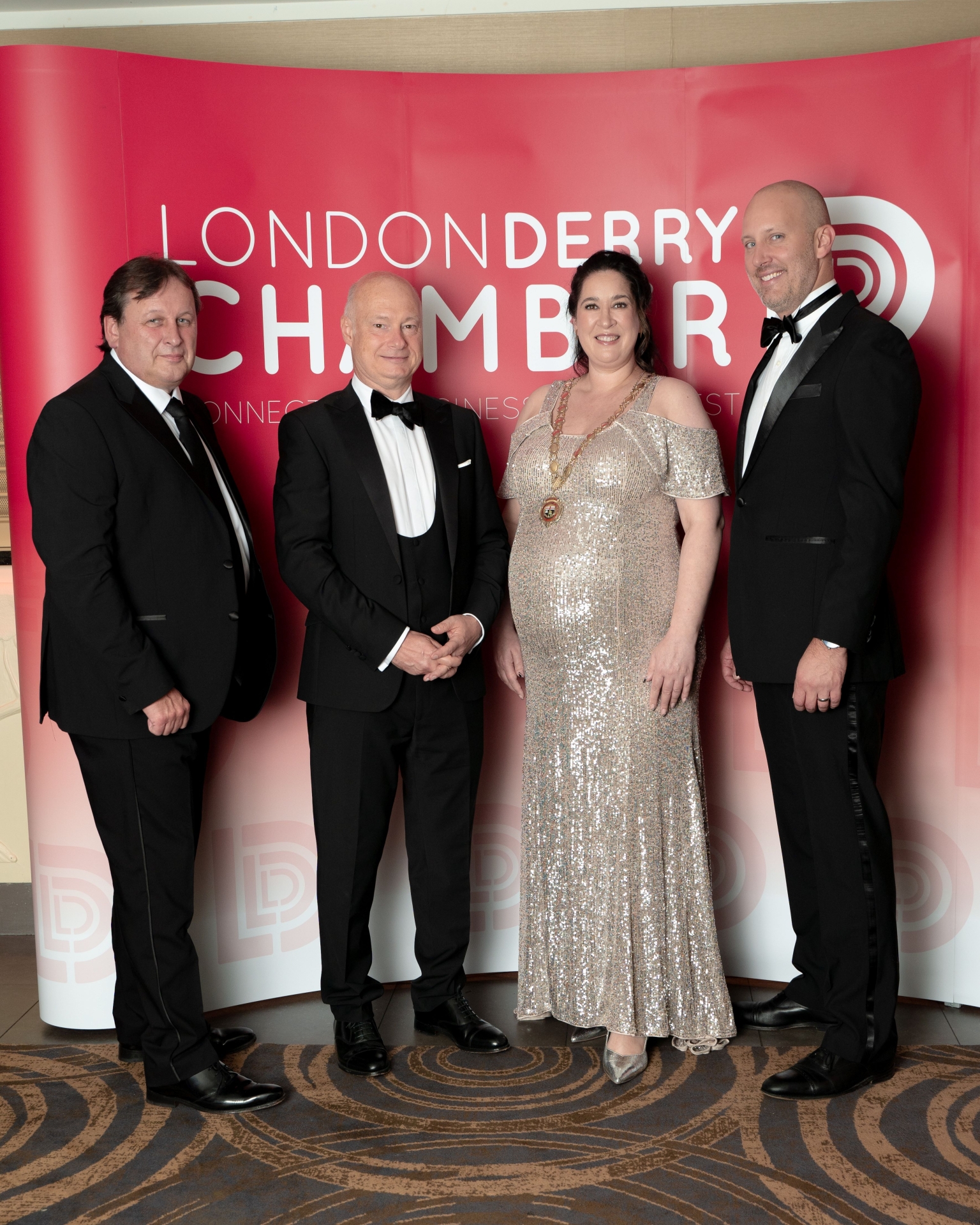 Leo Murphy, North West Regional College and Professor Paul Bartholomew, Ulster University, Chamber President Selina Horshi and US Consul General James Applegate.
