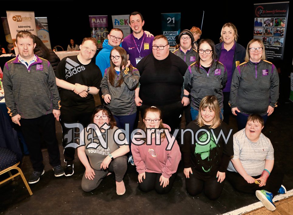 Foyle Down Syndrome Trust dance troupe "Down Right Fit Champions" who performed a dance routine at the Arc Fitness "Health Fest NW" held in the Millennium Forum. Included are Conor McGilloway and Laura Downey (staff). (Photo - Tom Heaney, nwpresspics)