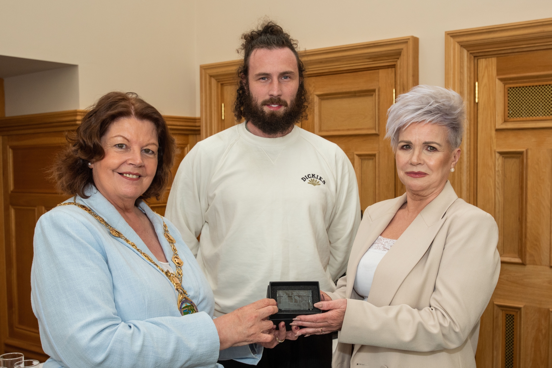 The Mayor Councillor Patrica Logue presented Patricia Breslin with a commemorative gift during a reception in the Guildhall to congratulate her on the completion of her 24 hour swim in the City Baths in April, in aid of Foyle Women’s Aid. Included is her coach Danny Quigley.