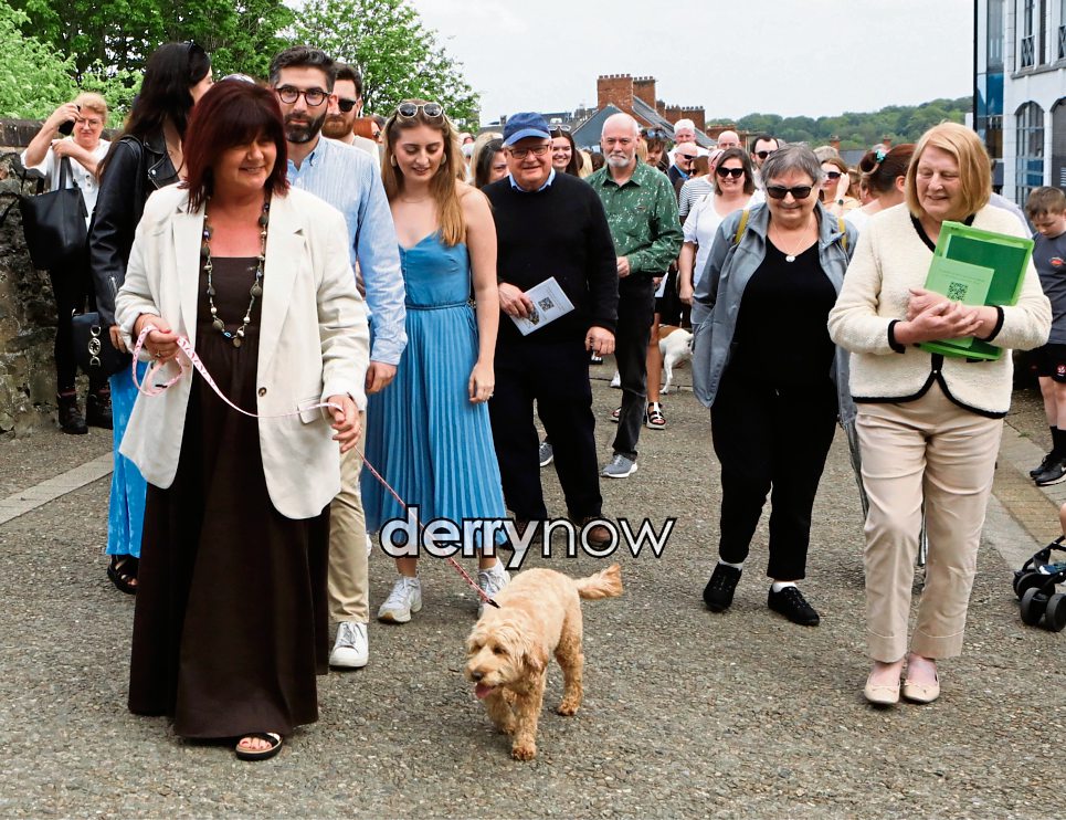 Deirdre Lusby, with Mark's dog "Skye" heading off, with family and freinds, on a walk around Derry Walls to commemorate her late husband's life.