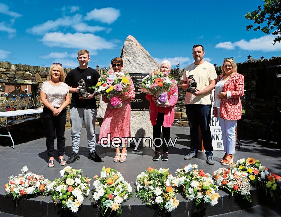 Group pictured at the presentation of commemorative gifts and flowers at the 50th anniversary of Vols Gerard Craig and David Russell. Included from left, are Ciara Ferguson, MLA, Paul Ferry, Patricia Moore, Bernie McDaid (sister of Gerard Craig), Gerard McDaid, and Sandra Duffy.