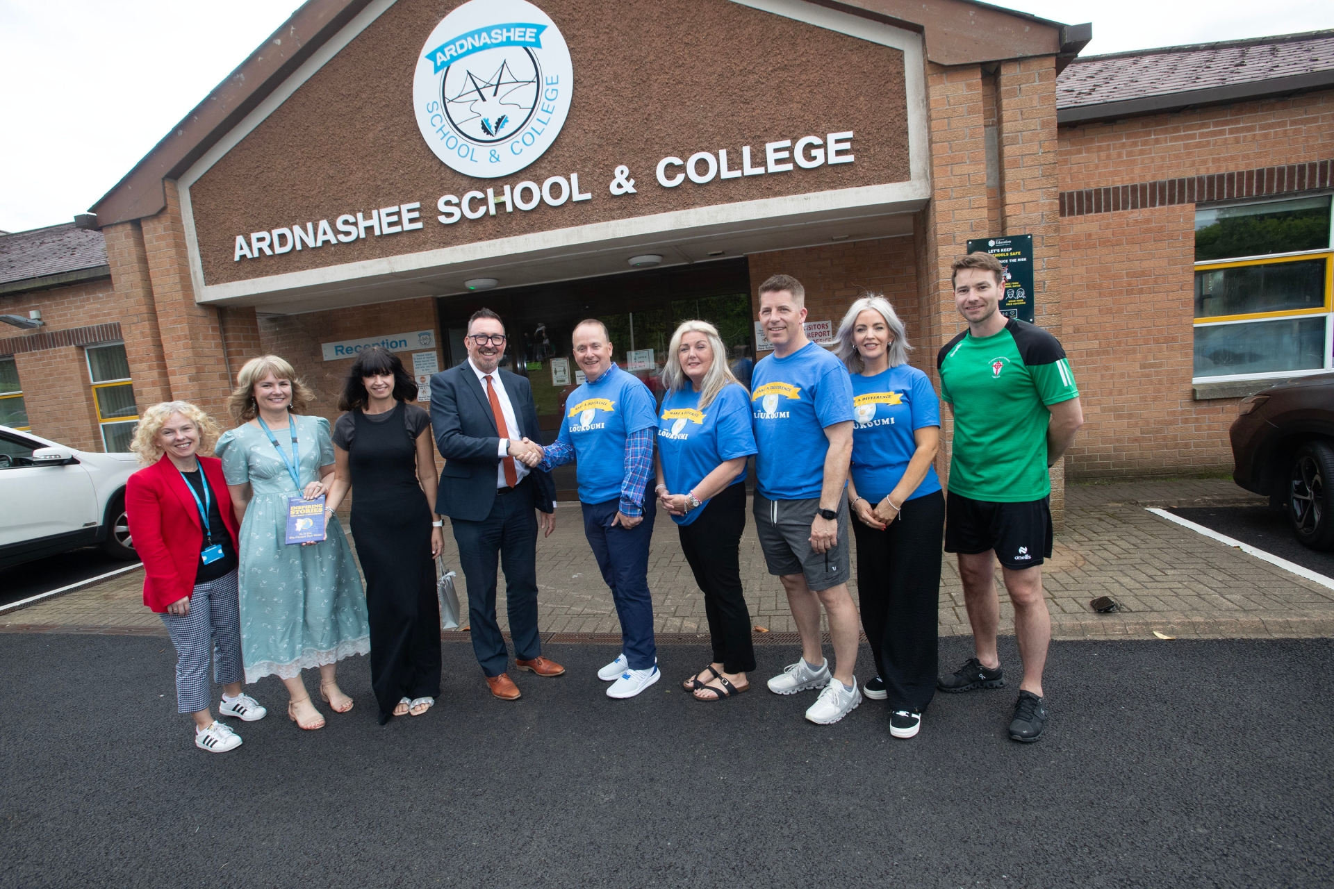 Staff from Ardnashee School and College welcome the 'Good Deeds Bus' representatives from St. Joseph's Boys School and the Loukoumi Foundation to the school.