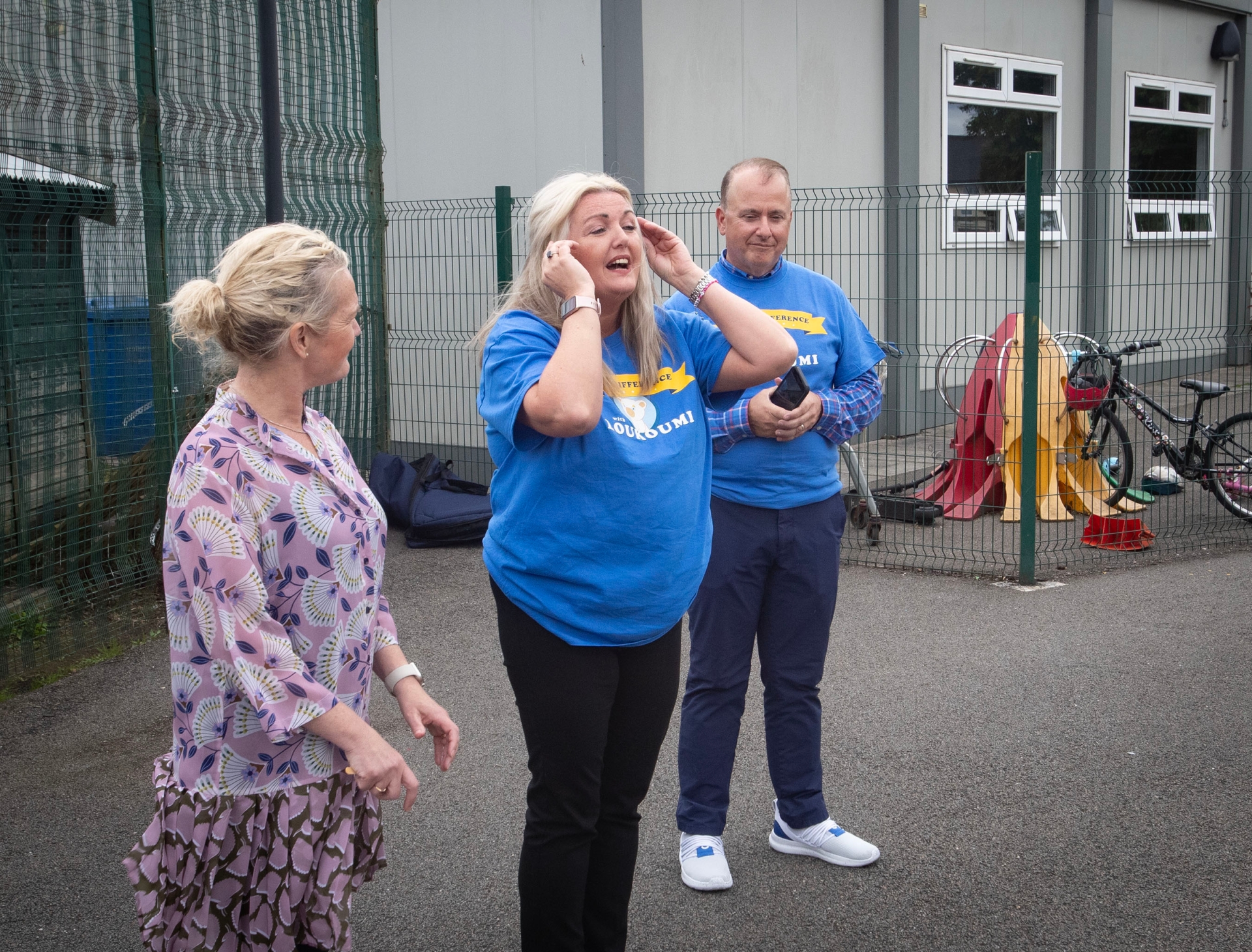 Mrs. Ciara Deane, Principal, St. Joseph's Boys School and Loukoumi director Nick Katsoris thank the children of Gaelscoil Eadain Mhoir for their warm welcome.