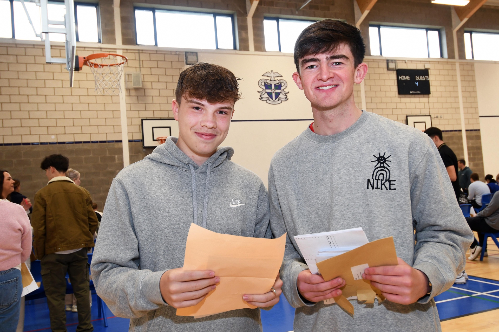 Pals Eoin Gorman and Fionn Duffy collecting their GCSE results at St. Columb's College on Thursday morning.