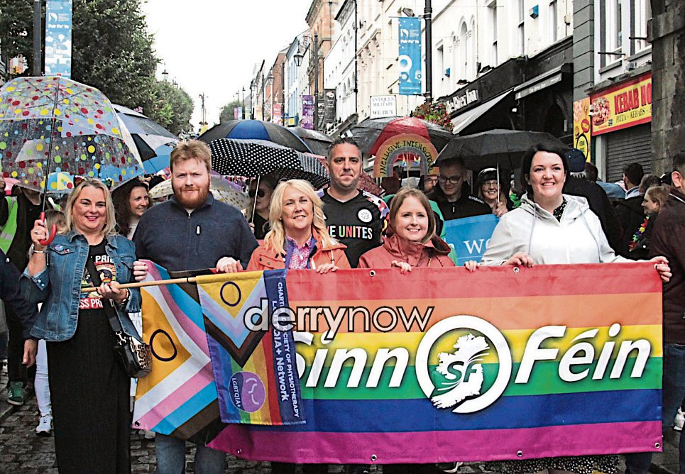 Supporting Foyle Pride are, from left, Cllr Sandra Duffy, Cllr Seán Fleming, Ciara Ferguson MLA, Mairéad Farrell TD and Cllr Emma McGinley.