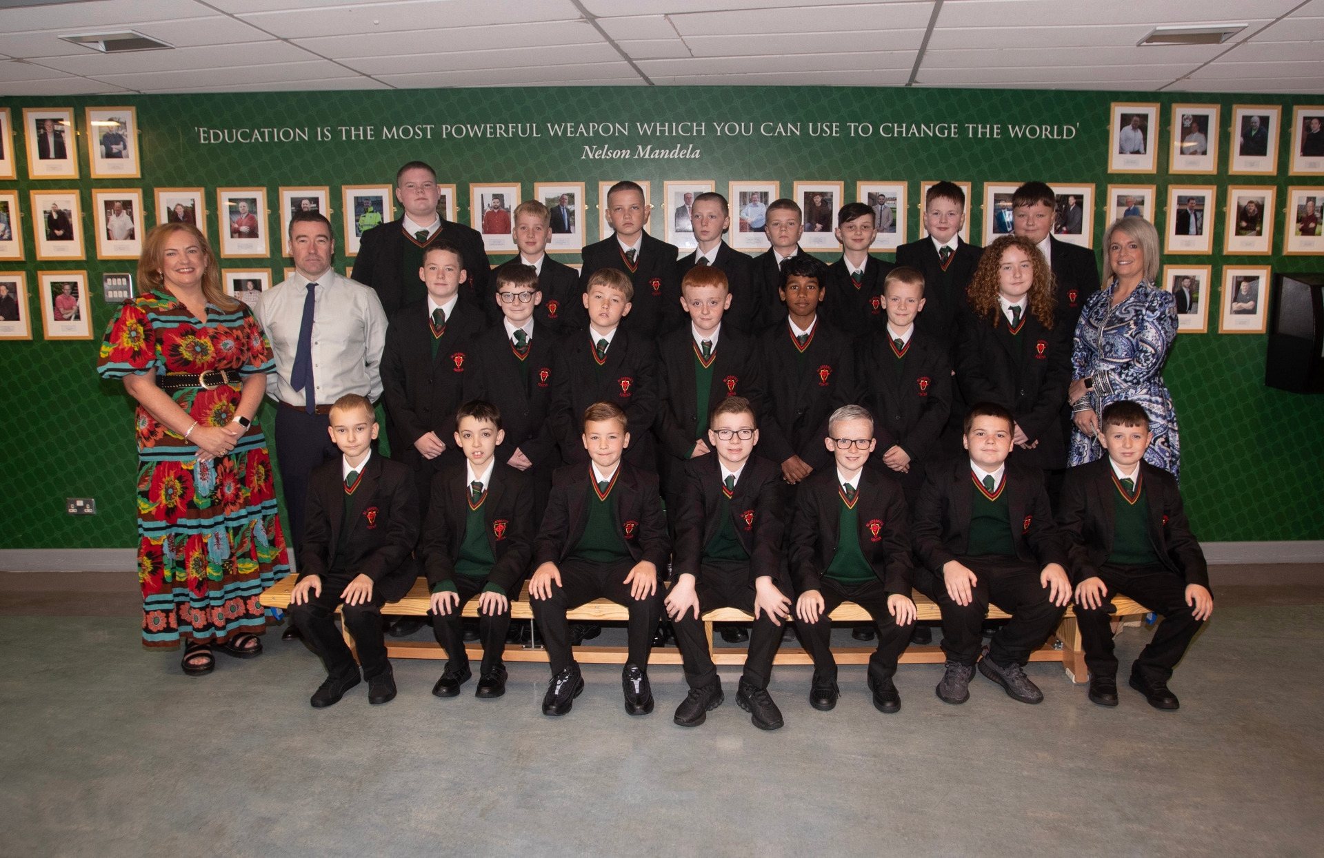 Mrs. Carla McCay pictured with her 814 Year 8 Form Class at St. Joseph's Boys School on Monday morning. On left is Mrs. Carla Hagan and Mr. Jon O'Loughlin, Head of Junior School. (Photos: Jim McCafferty Photography)