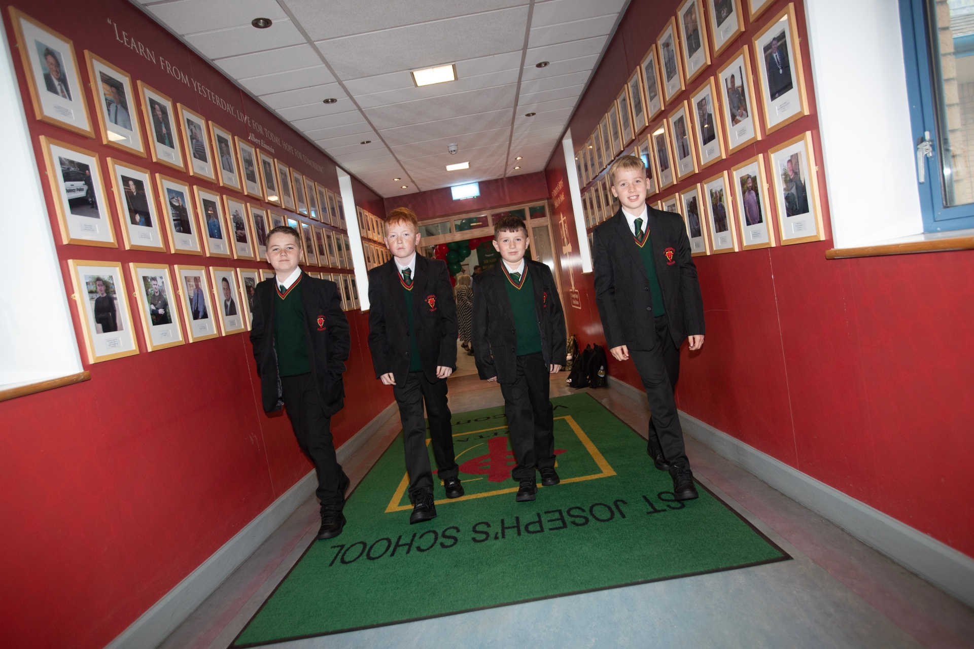 New Year 8 starts at St. Joseph's pictured on Monday morning as they make their way to assembly. From left, Charlie Carlin, Harry Johnston, David McKinney and Conleth McKay. (Photos: Jim McCafferty Photography)