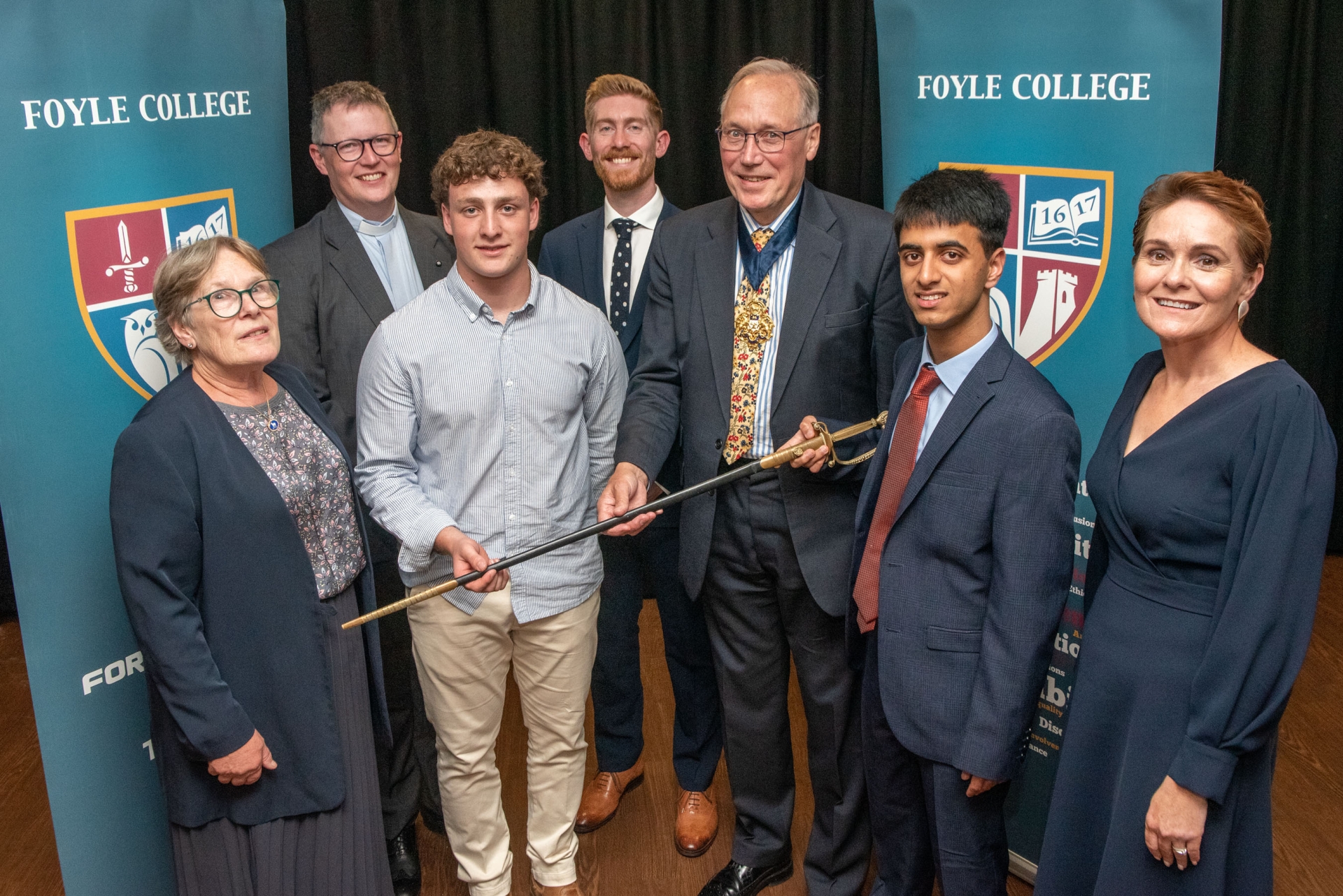 Mrs Deirdre McLaughlin, Principal of Foyle College and Guest of Honour, former pupil Dr. Matt Nicholl pictured with Year 13 Special Prize winners, Cameron Nawn, (Business Studies), Annabel Thomas King, (Spanish). Standing, Lily Craig, (ICT), Emer Afram, (Arts Subjects), Archdeacon Robert Miller, Chair Board of Governors, Erin McGarrigle. (Science Subjects) and Anna Doherty, (Academic Excellence).