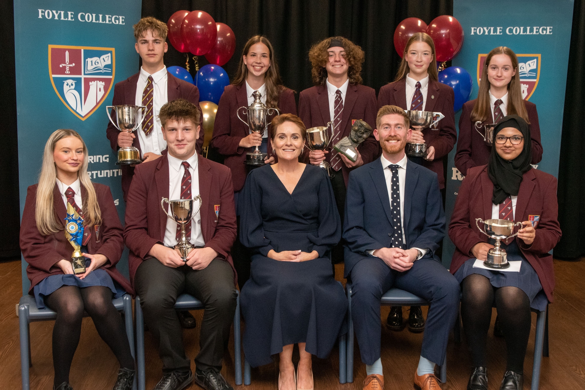 Foyle College Year 14 Social Prize awardees, Seated from left are, Robbie Patterson, (Academic Excellence and Science), Clara Bradley, (Design and Technology), Aayush Tetali, (Chada Bursary for Student going forward to Medical School). Standing from left, Katrina Knox who presented the Knox Perpetual Cup for Debating to Hussain Bedair and Rueben Carroll-Sharkey, Ruben also received the WM Lynn Bursary for Geology, Mrs Deirdre McLaughlin, Principal and Archdeacon Robert Miller, Chair of the Board of Governors and Guest of Honour Dr. Matt Nicholl. (Photos: Martin McKeown)