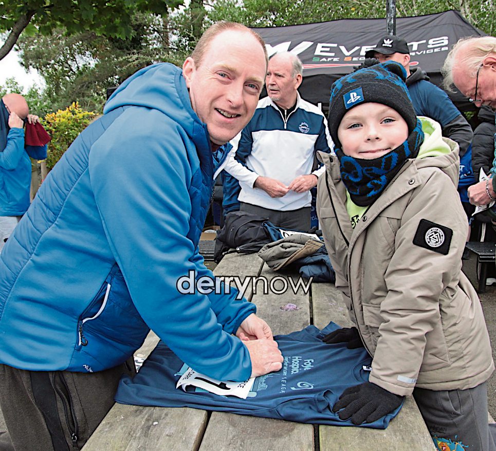 John Hampsey attaching his son, John James' number to his t-shirt for The Foyle Hospice Male Walk/Run.