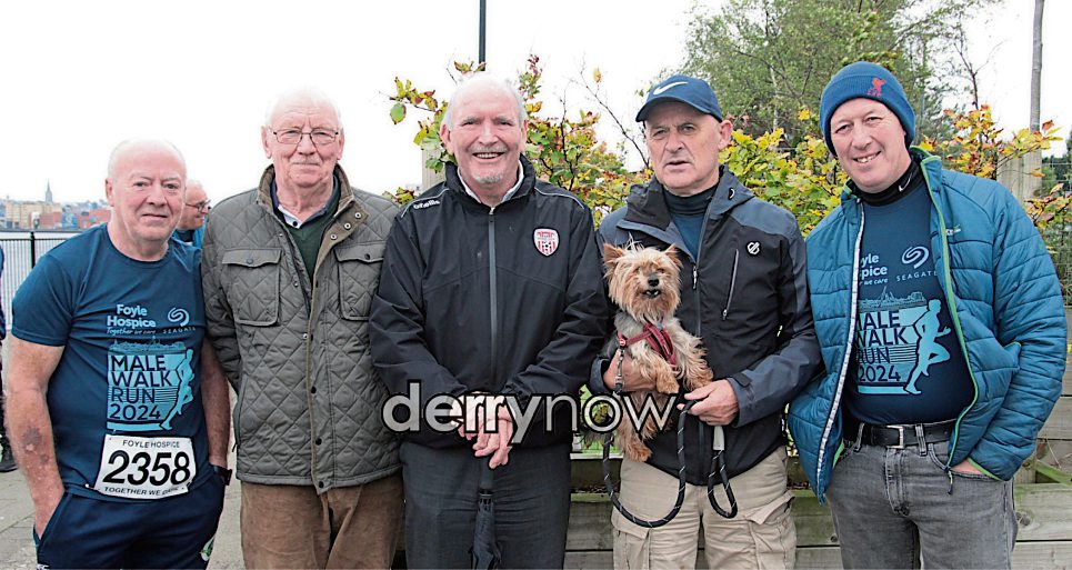 Tommy O'Neill, Jim Melaugh, Willie Barrett, John Meehan and Willie Meehan along with Cooper the dog taking part in the Foyle Hospice Male Walk/Run. (Photos - Deirdre Heaney, nwpresspics)