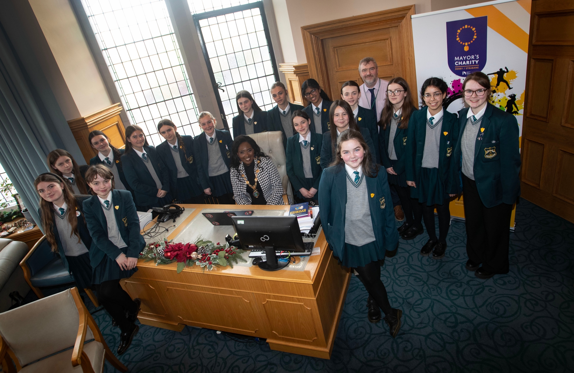 GUILDHALL VISIT. . . .The Mayor of Derry City and Strabane District Council, Lilian Seenoi-Barr in conversation with junior student prefects from Thornhill College during their visit to the Guildhall on Tuesday afternoon. Included is Mr. Greg White, teacher. (Photos: Jim McCafferty Photography)