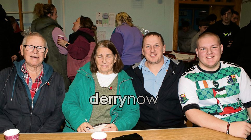Michael and Celine McLaughlin pictured with their son Michael and grandson Michael as they called in for their cuppa at St. Joseph's Boys' School Coffee Morning for Gaza.