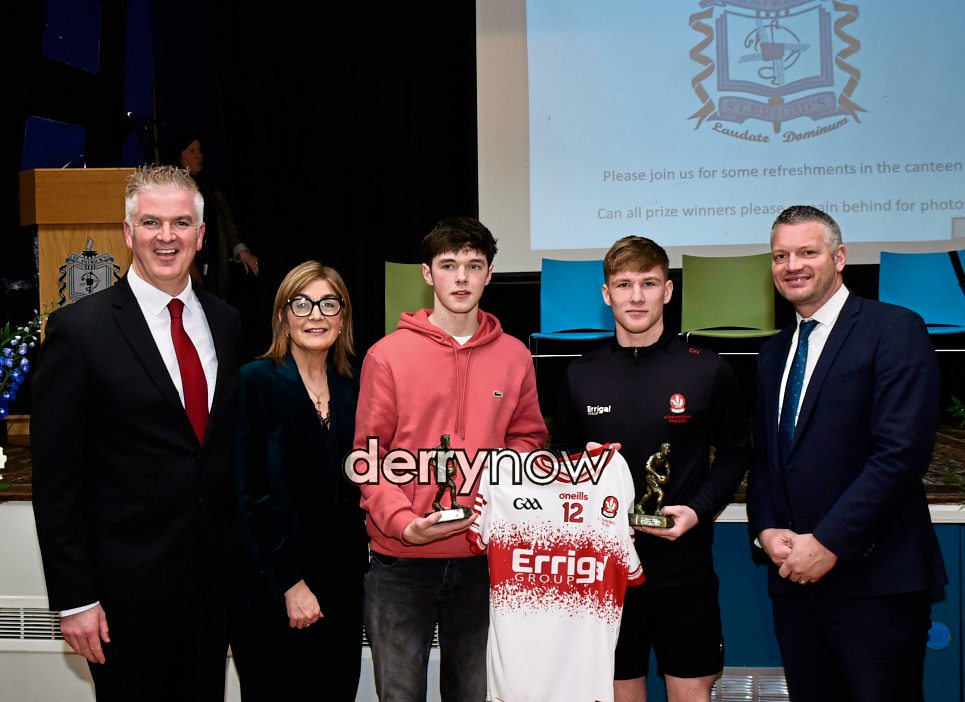 Principal Philip McCullagh, Helen Crossan, Blain Conwell and Caoimhin Hargan (Derry GAA U20 Players) and Stephen Barker. (Photos - Kerrie Quinn, nwpresspics)