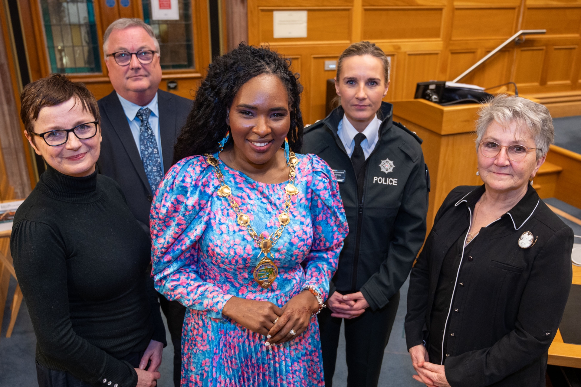The Mayor Councillor Lilian Seenoi-Barr has hosted a Public Meeting on Ending Violence Against Women and Girls in the Guildhall, Statutory Sector panelists, Anne Weir, Area Manager for the Promoting Positive Relationship Programme, Probation Board NI, Eddie Doherty, NIHE Area Manager, Gillian Kearney, Chief Superintendent, PSNI, facilitator, Professor Marie Breen-Smyth.