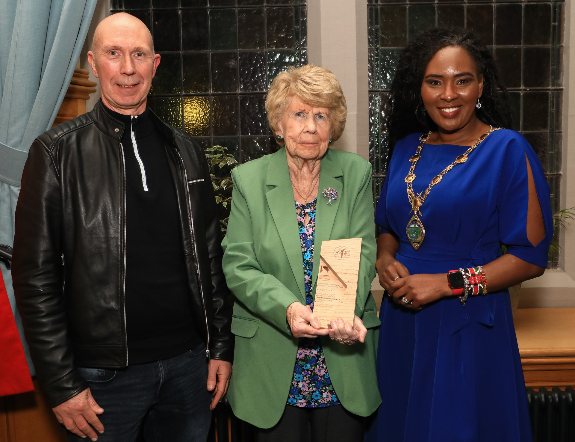 Mayor Lilian Seenoi Barr who held a reception for Phyllis Adams to mark her retirement, after 44 years volunteering with the Samaritans, in the Mayor's Parlour. Included is Phyllis' son Mal.