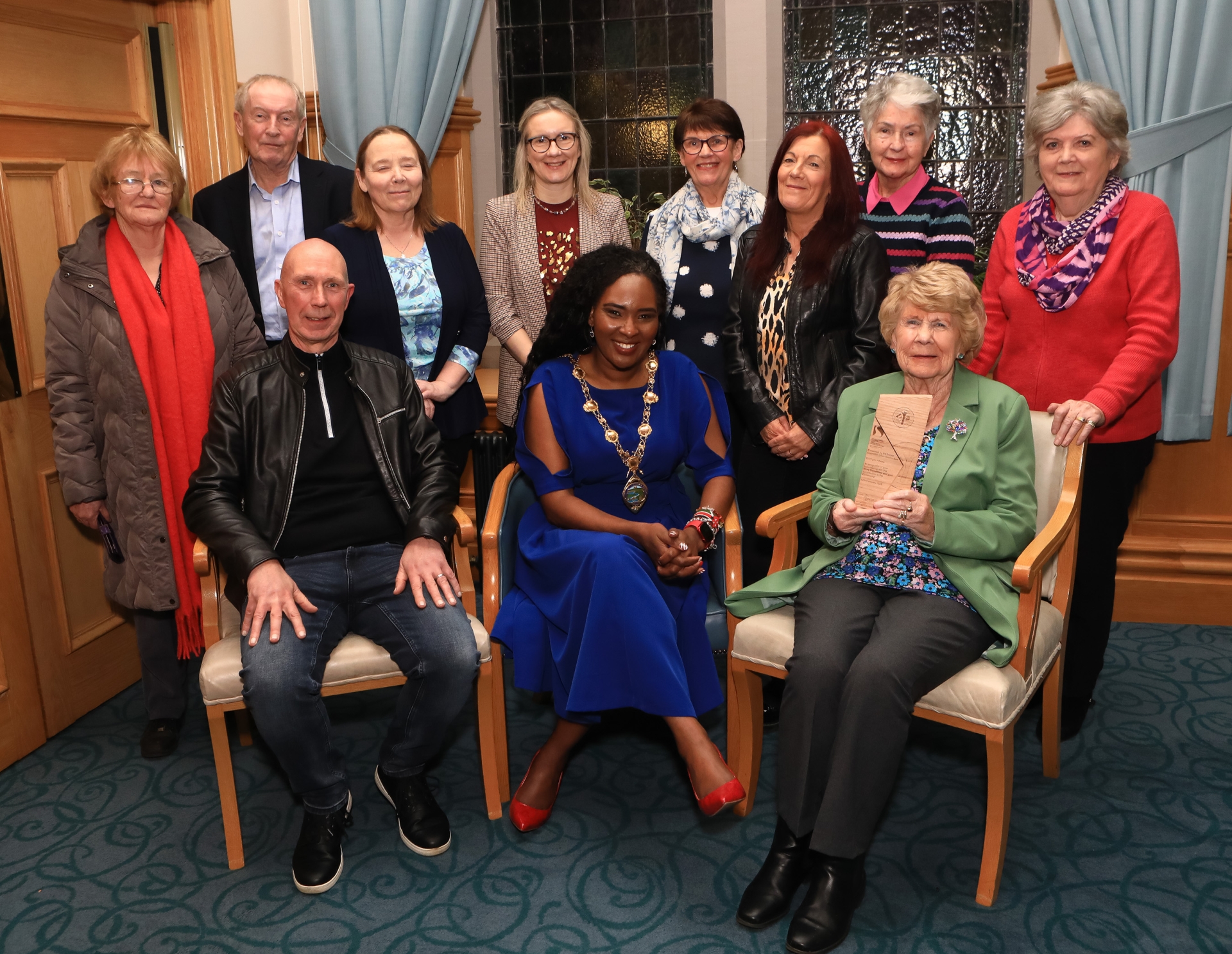 Mayor Lilian Seenoi Barr making a presentation to Phyllis Adams to mark her retirement, after 44 years volunteering with the Samaritans, at a reception held in the Mayor's Parlour. Included seated left, Mal (son) and representatives from the Samaritans.