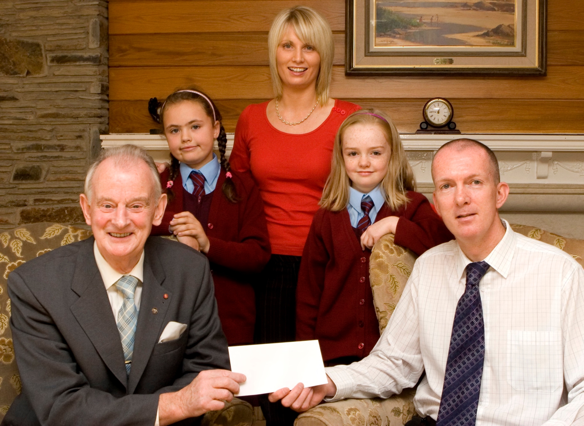 Jim McGuinness handing over a cheque for £500, in memory of Aine McLaughlin, raised by him taking part in the Waterside Half Marathon. Included are Aimee McLaughlin, Andrina Arbuckle, Foyle Hospice, and Anna McGuinness.