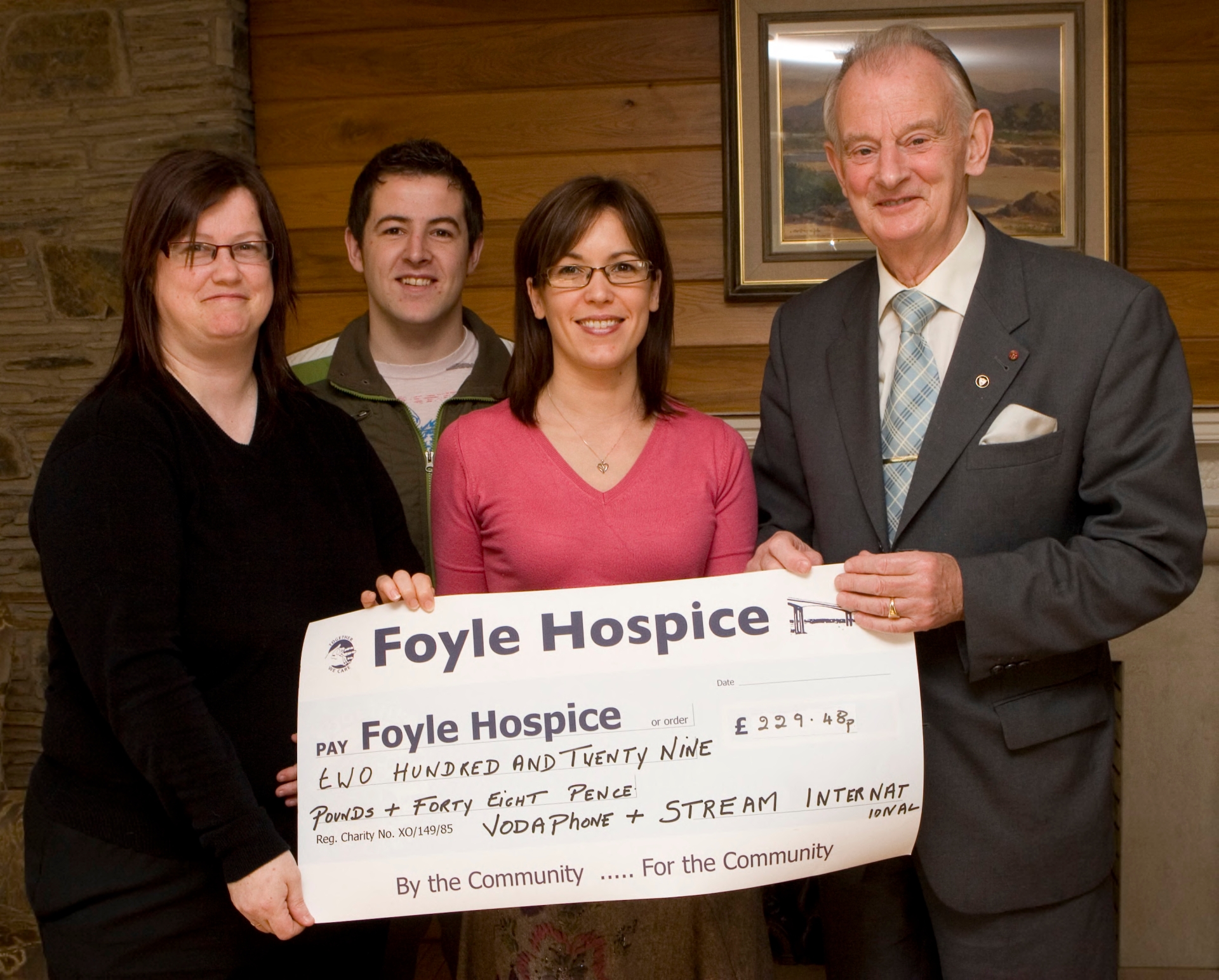 Staff from Vodaphone & Stream International handing over a cheque for £229.48 to Dr. Tom McGinley. Included, from left, are Annemarie Fox, David Scalnon and Annamarie Gorman.