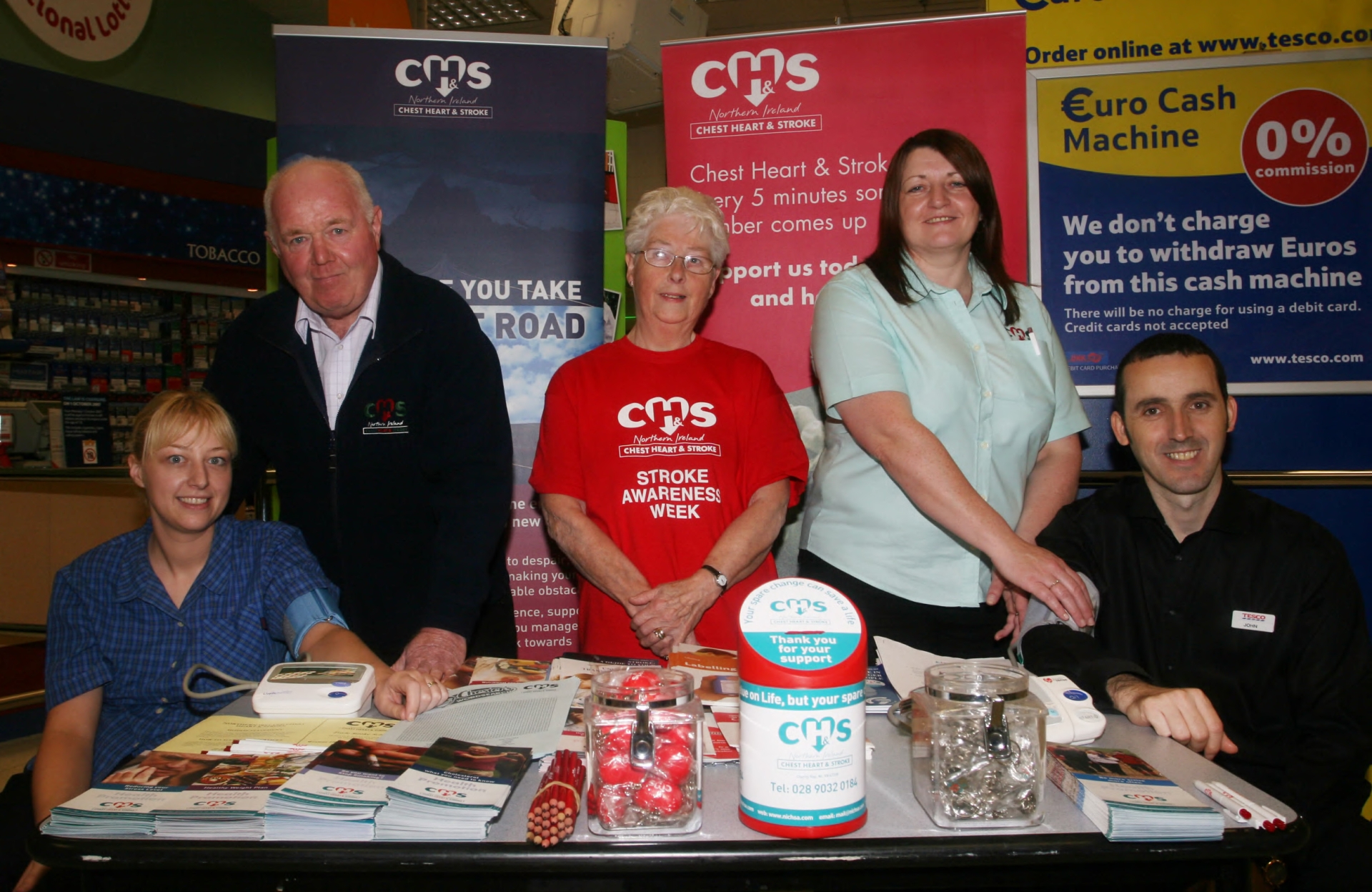 Sarah Louise Cadden, Tescos Customer Services seated left, and John Wade, Tescos Fresh Food Manager seated right, having their blood pressures checked by members of Chest, heart & Stroke N. Ireland, during the awareness day held at Tescos. Pictured standing from left, Liam Quigley, Peggy Ramsey & Rita Heaney, Chest, Heart & Stroke.