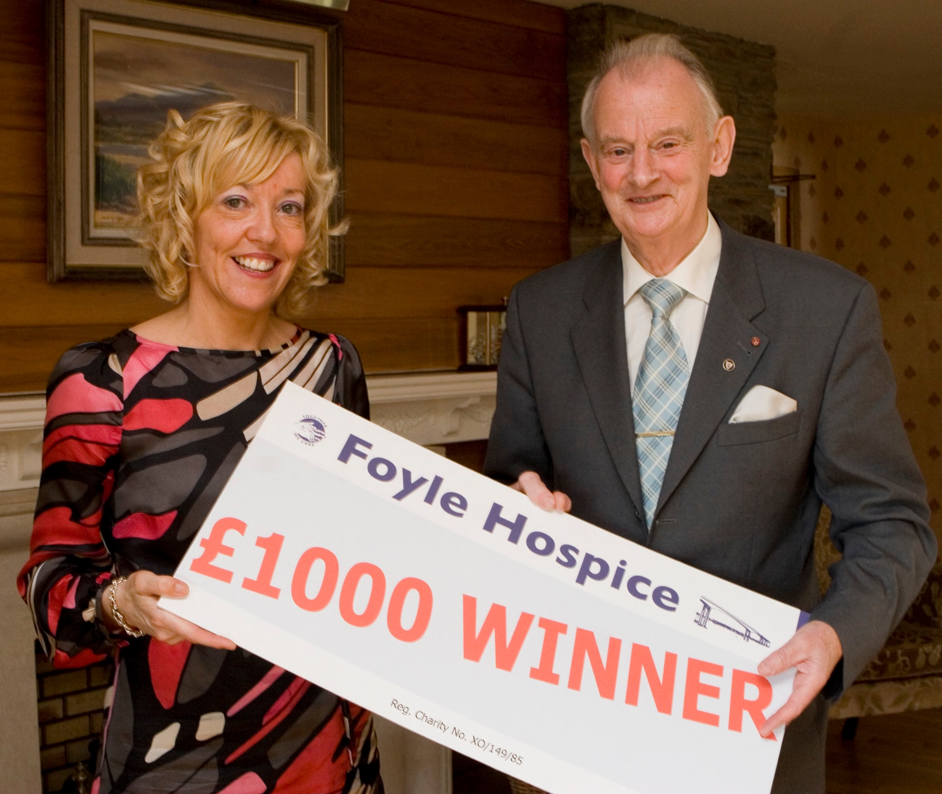 Dr. Tom McGinley presenting the £1,000 prize in the Foyle Hospice Draw, to Giovanna McKinney.