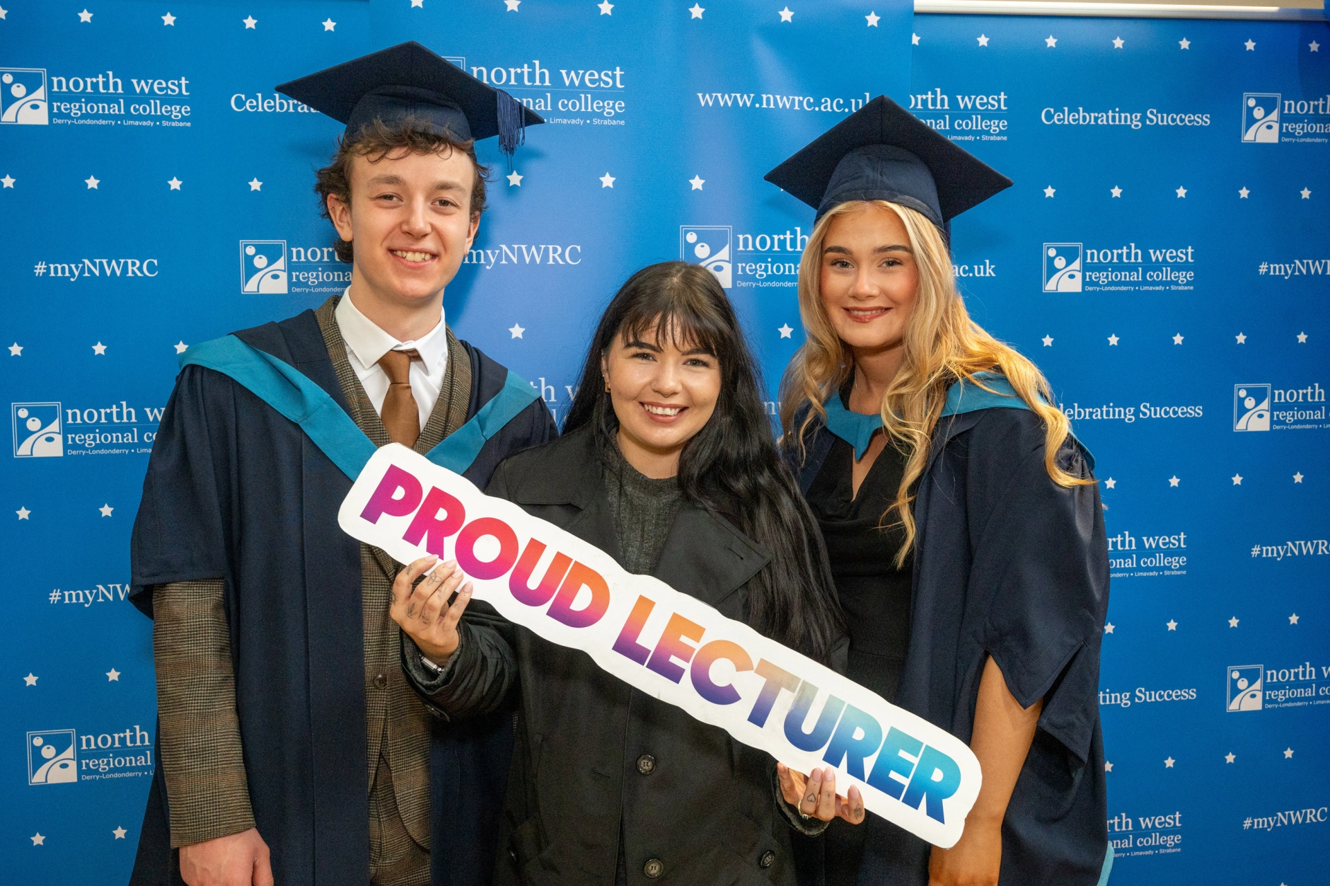 Proud lecturer Karen Roarty with students Jack O'Sullivan and Aoibheann Mooney at the 2025 NWRC Higher Education and Access Graduation Ceremony.