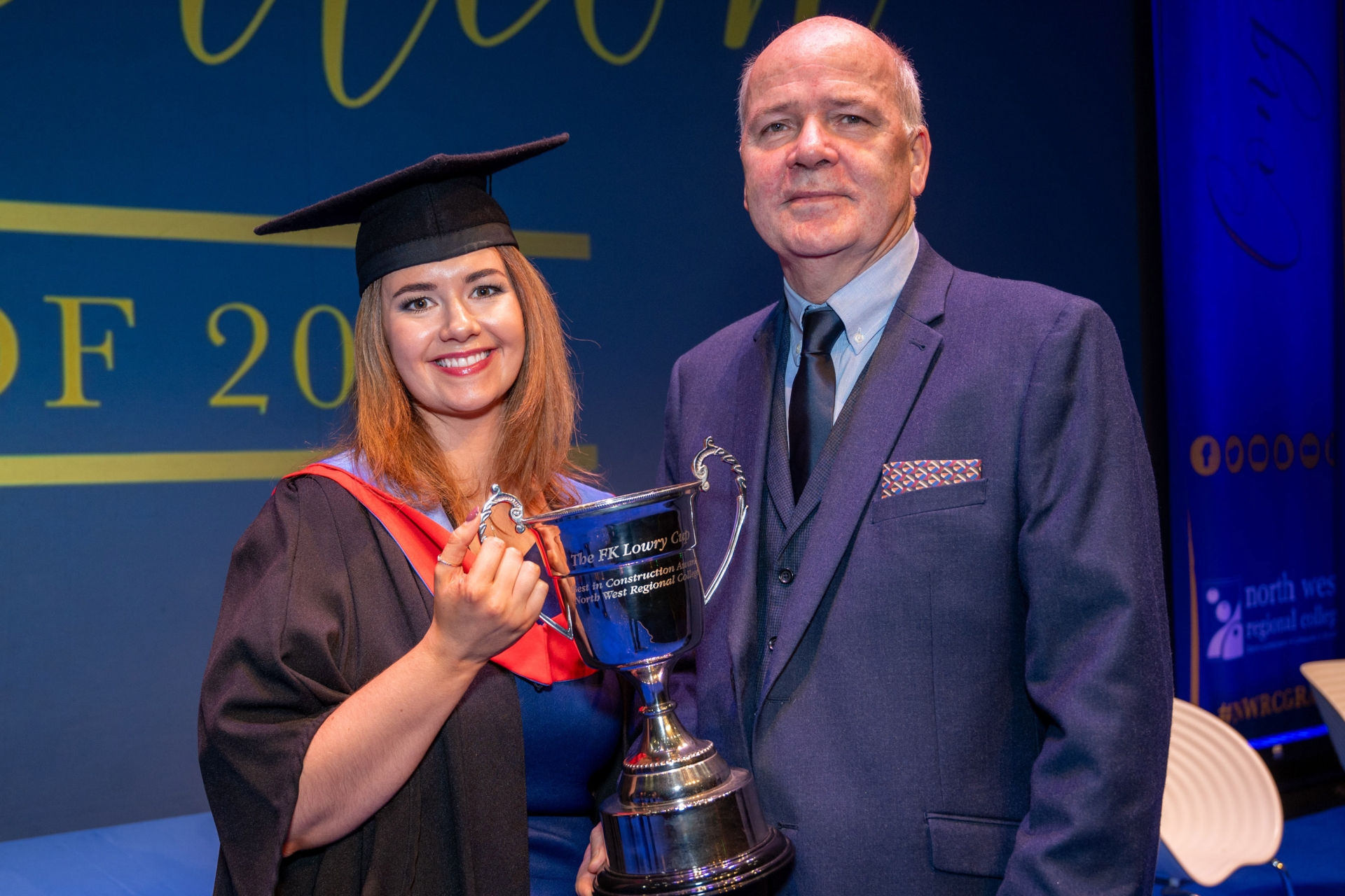 Sarah Jane Glenn who graduated from NWRC with a HLA in Modern Construction & Renewables and was presented with the FK Lowry Cup Best in Construction by Lecturer Tony McDaid at the college’s graduation ceremony. Sarah also received the special award for Best HNC in Construction & Built Environment from NWRC. (Photos: Martin McKeown)