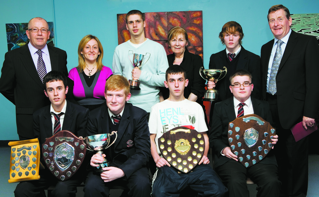 From left, are Gearoid Houston (languages), Conor Harkin (music), Ryan Dazell (business studies), and Jonathan Bradley (geography). Standing, from left, are Charlie O'Donnell, guest of honour, Marie Stawbridge, Head of Music, Sean Paul Carlin-O'Connor (history), Geraldine Mellon, vice-principal), Sean Doherty (best Year 10 award), and Danny Kelly (BOG).