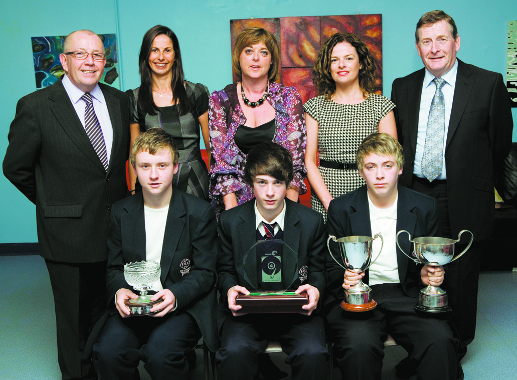From left are Eamon Quigley (English award), Ryan Deery (Seagate STEM Cup), Ronan Lavery (James Doherty Cup science award). Standing, from left, are Charlie O'Donnell, guest of honour, Ciara Lees, Head of Science, Lorraine Tarr (BOG), Fional Harrigan, Head of English, Danny Kelly (BOG).