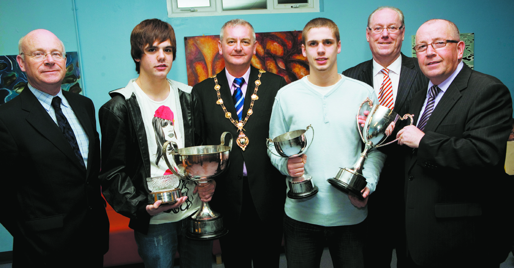 Mayor Paul Fleming pictured at St. Peter's High School prizegiving, with, from left, Joseph Martin, chairman, Board of Governors, Adrian Lanigan (BOG Cup for Best GCSE results), and, from right, Charlie O'Donnell, guest of honour, presenting the Christian Brothers Cup Award for academic performance to Sean Paul Carlin-O'Connor, and Martin Bowen, principal.