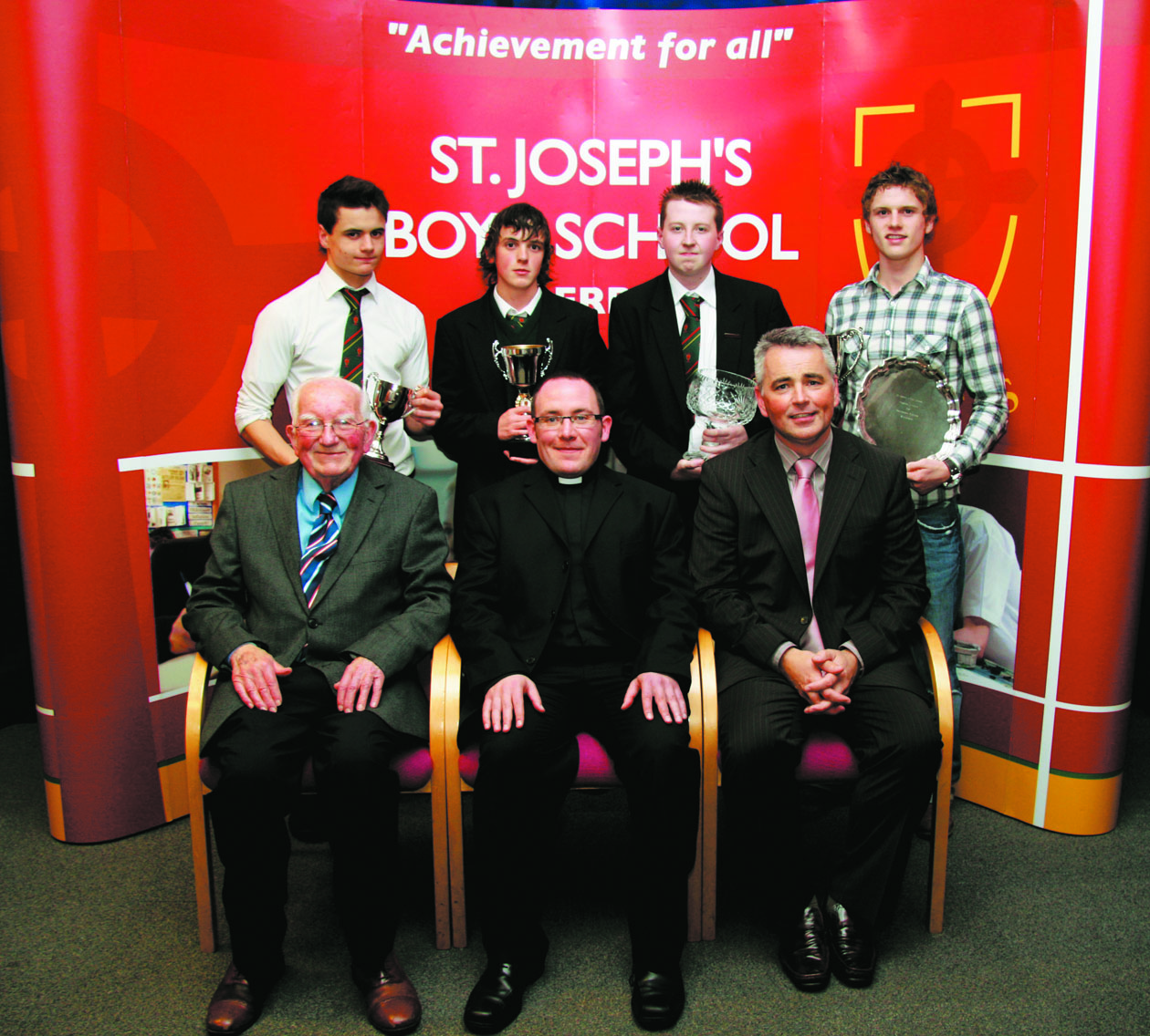 Ronan Mc Donald (best AS Level), Eamon Colhoun (best A Levels), Sean Gallagher and Conan Maahan (best GCSE grades) pictured with Father Ferguson, Mr Harkin and Mr J Doherty